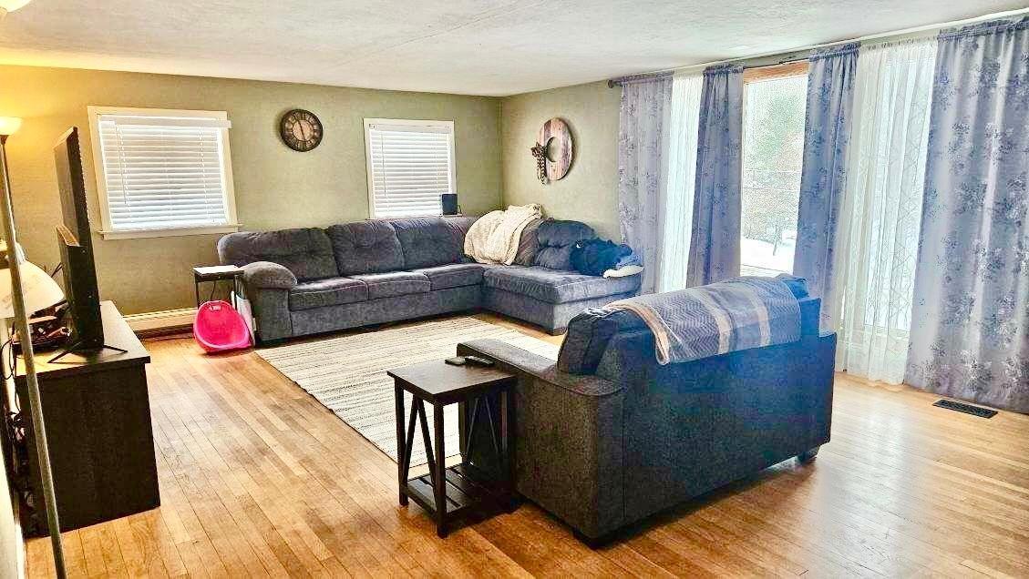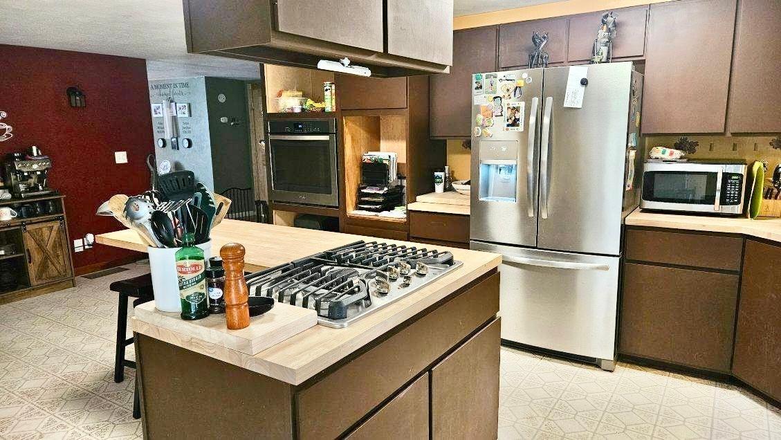 Discover the perfect blend of comfort and style in this beautifully updated ranch-style home featuring modern upgrades and thoughtful details throughout. A brand-new pitched roof (2023) enhances the home's appeal. The kitchen shines with stylish butcher block countertops, while the two remodeled bathrooms upstairs are added convenience. The main level features three bedrooms, 1.5 baths, and a living, dining, and kitchen area—perfect for gatherings. This could be opened up with the ceiling. A sliding glass door off the kitchen leads to the backyard, inviting indoor-outdoor living. The spacious lower level offers incredible versatility with a den, three additional rooms, a full bathroom, laundry area. Direct access to the covered garage. Serene beauty of a private pond.